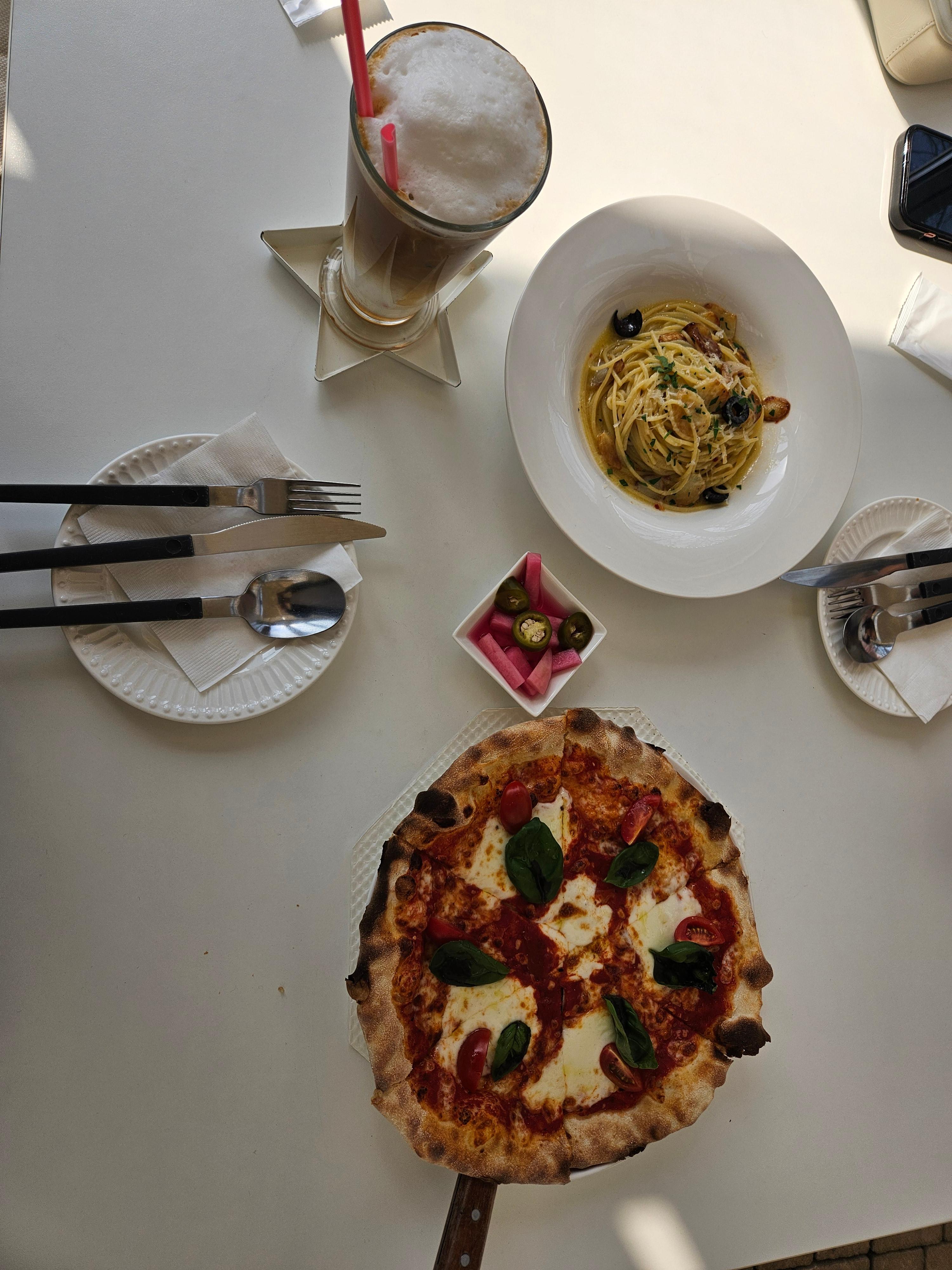 배가 너무 고팠던 터라 마르게리따 피자와 알리오올리오, 바닐라라떼 주문 ~!!