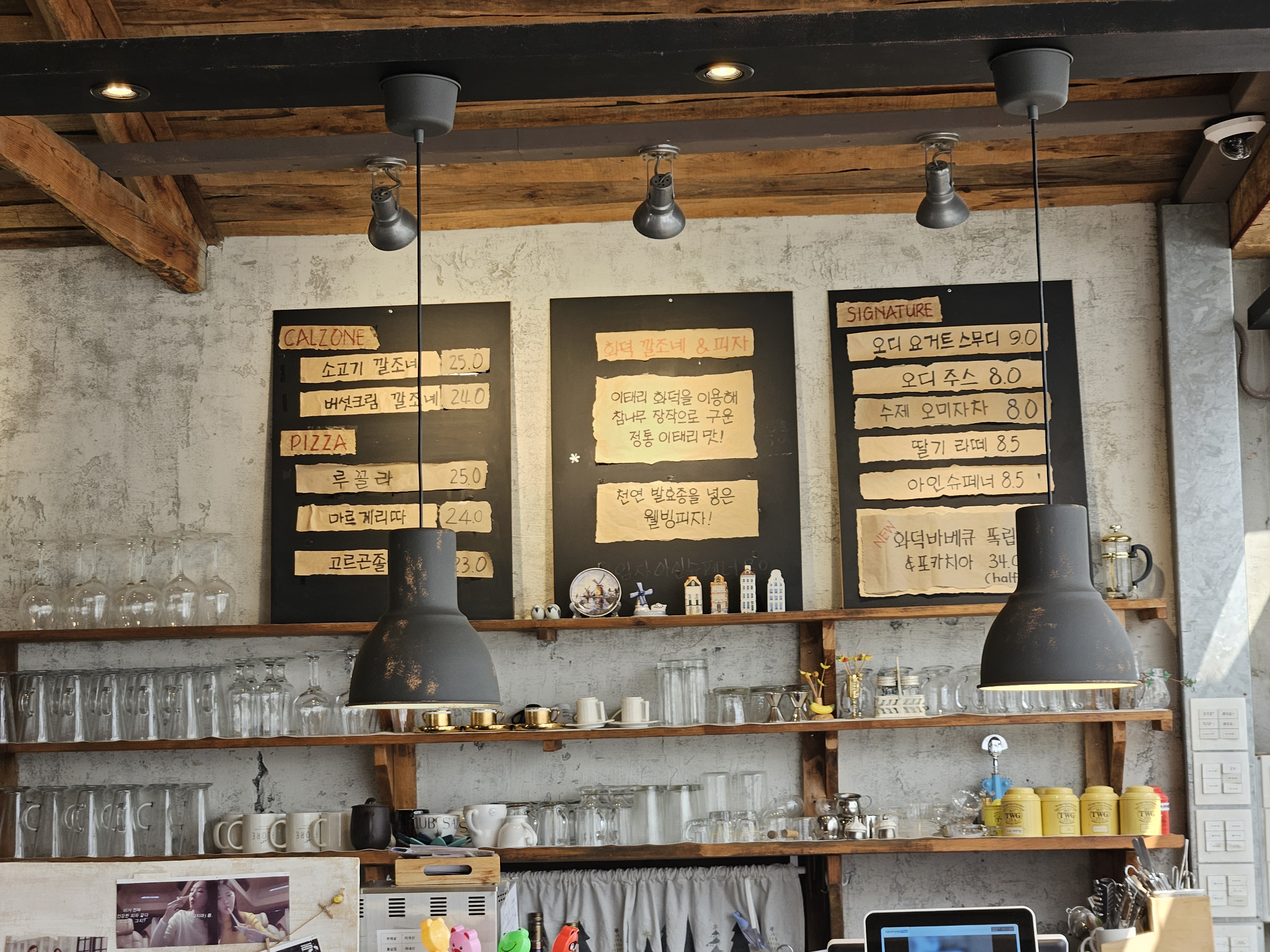 내부로 오면 아기자기한 소품들과 이렇게 큰 메뉴판이 보여요